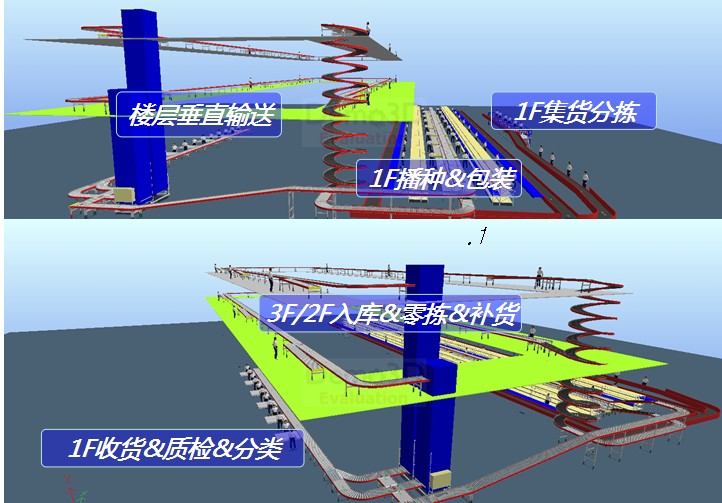 服裝行業大型電商物流項目;箱輸送系統達到1km,集成螺旋輥道機、垂直提升機、電子標簽播種及各種箱輸送分揀設備;